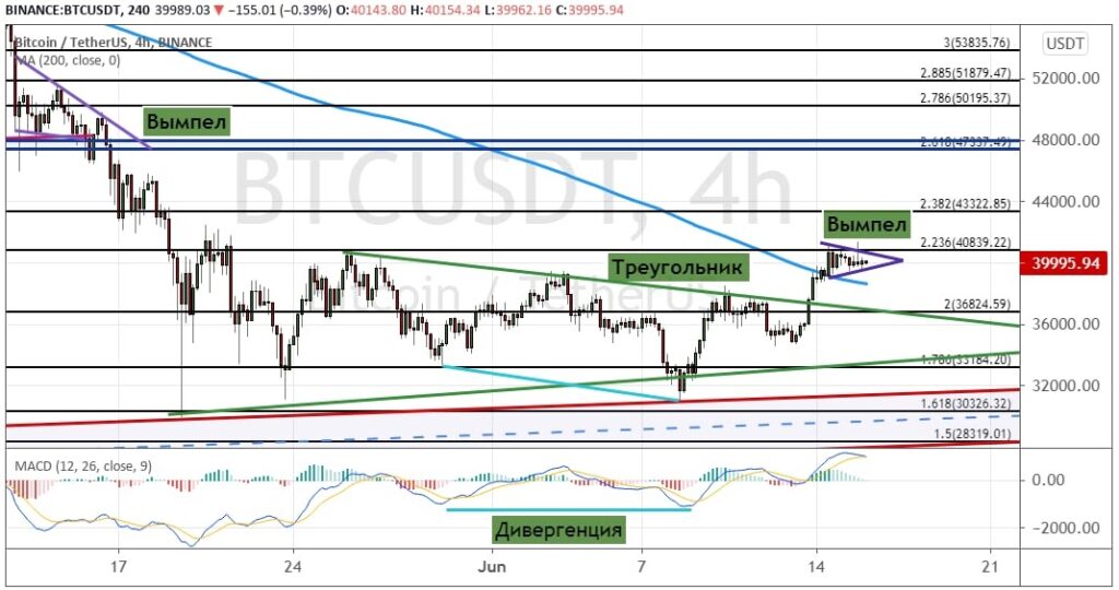 На графике ниже можно увидеть, как котировки биткоина сформировали модель теханализа «Вымпел». Если им удастся выйти за границы этой модели, это может стать сигналом о продолжении роста к уровням $40 800, $43 300, $45 300 и кластеру уровней $47 400 – $48 000.