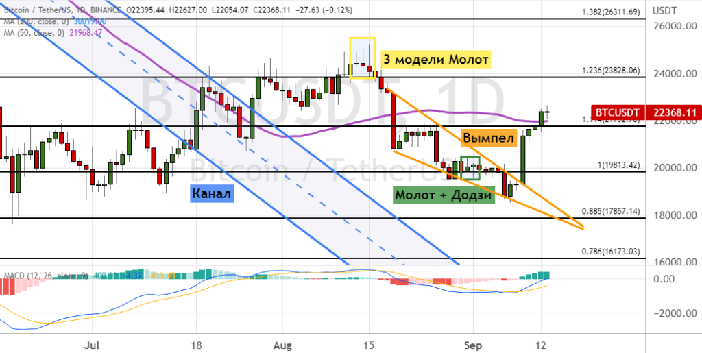 Если котировки BTC опустятся ниже текущего уровня поддержки, где также проходит линия 50-дневной простой скользящей средней (SMA), то в рамках краткосрочного нисходящего тренда цена биткоина опустится до уровней $21 000, $19 800 и $19 000. Падение ниже $19 000 станет сигналом о восстановлении медвежьего тренда, который приведет к более глубокой коррекции. Она обвалит стоимость биткоина до уровней $17 800, $17 000 и $16 100. В пользу этой динамики указывают три модели теханализа «Молот» (обозначены желтыми линиями), а также сохраняющие актуальность модели «Молот» и «Додзи» (обозначены линиями зеленого цвета).