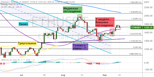 Однако если быкам удастся вновь занять доминирующую позицию, это приведет к росту стоимости эфира выше уровня сопротивления $1 730. Первыми целями для быков выступают уровни  $1 700, $1730, $1 800 и $1 900. В рамках краткосрочного восходящего тренда котировки ETH направятся к границам кластера $2 000–$2 055, выше которых расположилась линия 200-дневной SMA. В пользу развития этого сценария торгов указывают сигналы в виде пробития верхних границ «Канала» (обозначен бирюзовым цветом) и «Треугольника», а также две модели «Внешнее поглощение» (отмечены темно-розовым цветом).