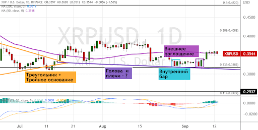 Текущие котировки XRP продолжают консолидироваться ниже уровня сопротивления $0.36, где также проходит линия 50-дневной SMA.