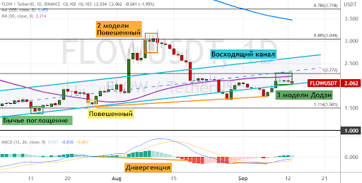 Но в случае падения котировок FLOW ниже границ консолидации $1.7–$2, в районе которых также проходит нижняя грань модели «Восходящий канал», медвежья динамика направит альткоин к линии поддержки $1.6. Более глубокая коррекция приведет к снижению стоимости FLOW до границ консолидации $1.2–$1.5. В пользу развития краткосрочной нисходящей динамики указывают две модели теханализа «Повешенный» (обозначены оранжевым цветом). Также в пользу снижения могут указывать вероятно формирующиеся три модели «Додзи» (обозначены зеленым цветом) и преодоление нижней границы «Восходящего канала».