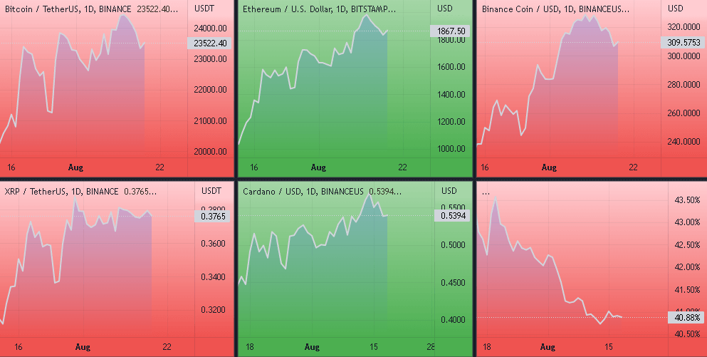 Динамика котировок BTC, ETH, BNB, ADA, XRP (дневной таймфрейм) и график доминации биткоина. Источник