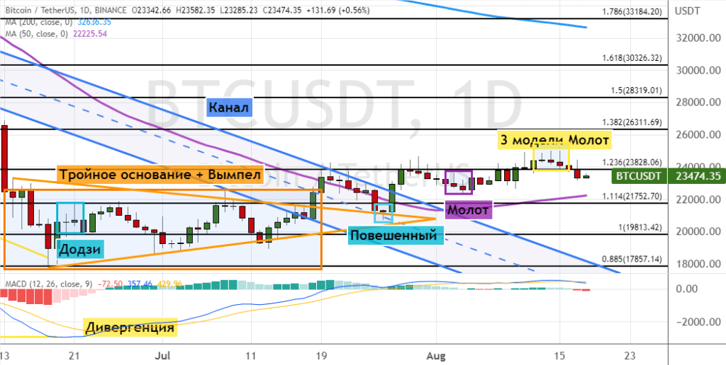 Сейчас быкам важно закрепиться выше текущих уровней сопротивления $24 000 и $25 000. Это станет сигналом о восстановлении краткосрочной восходящей динамики, которая позволит быкам направиться к первой цели на уровне $26 300. Сохранение тенденции приведет к росту котировок первой криптовалюты до уровня $28 300 и границ консолидации $30 300–$33 200, между которыми проходит линия 200-дневной простой скользящей средней (SMA). В пользу восстановления краткосрочного восходящего тренда указывают шесть сигналов теханализа: модели «Молот», «Тройное основание», «Повешенный» (обозначена бирюзовым цветом), прорыв верхних границ моделей «Вымпел» и «Нисходящий канал», а также бычья дивергенция между ценой на графике и осцилляторе MACD.