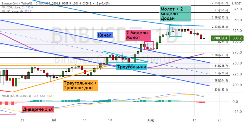 Но если быки смогут закрепиться выше уровней $330 и $340, между которыми также проходит линия 200-дневной SMA, это станет сигналом о развитии краткосрочной бычьей динамики. Она позволит BNB достичь первой цели на уровне $350. Сохранение восходящей динамики приведет к росту стоимости альткоина до уровня $366. В пользу реализации этого прогноза указывает сохранение актуальности двух моделей теханализа «Молот» (обозначены бордовым цветом), пробитие верхней грани «Нисходящего канала» (обозначена синим цветом) и границ двух моделей «Треугольник»,  продолжающаяся реализация модели «Тройное дно», а также дивергенция между ценой на графике и осцилляторе MACD.