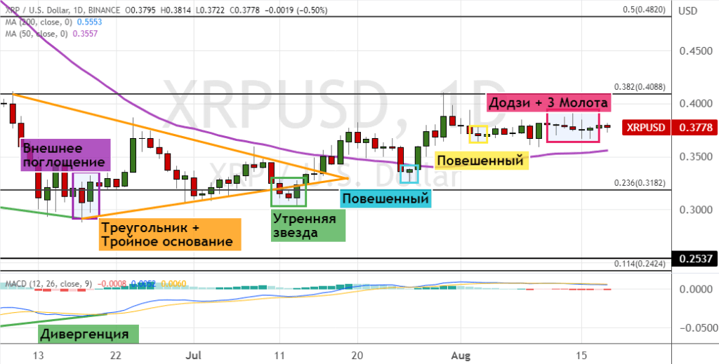 Но если дневные свечи закроются ниже поддержки $0.35, где также проходит линия 50-дневной SMA, это станет сигналом о развитии краткосрочной медвежьей динамики. В этом случае котировки XRP устремятся к первым целям — $0.32 и $0.3. Более глубокая коррекция приведет к движению котировок альткоина к границам кластера $0.24–$0.25. В пользу реализации этого прогноза указывает сигнал теханализа в виде возможного формирования модели «Додзи» и трех моделей «Молот» (обозначены розовыми линиями).