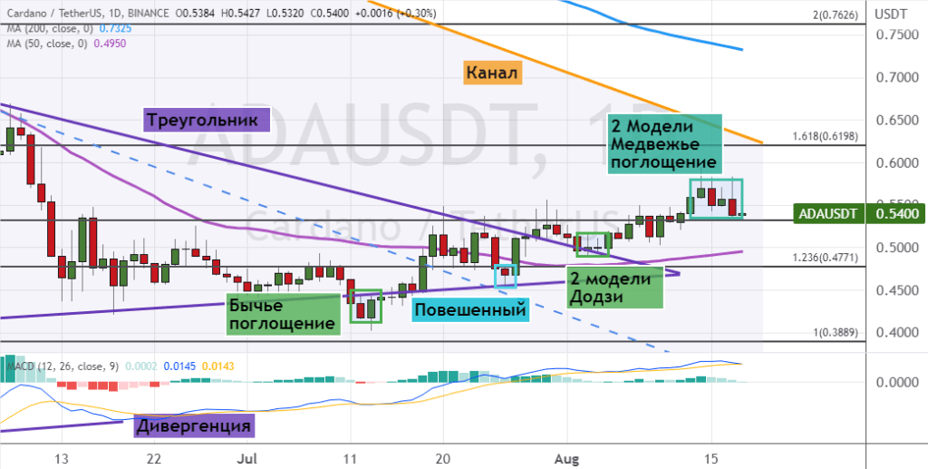 Если стоимость альткоина сможет пробить текущий уровень сопротивления $0.60, то дальше ADA направится к уровням $0.62 и $0.7, между которыми также проходит верхняя граница модели теханализа «Нисходящий канал» (обозначен оранжевыми линиями). Сохранение краткосрочного восходящего тренда позволит быкам протестировать уровень $0.76, ниже которого расположилась линия 200-дневной SMA. В пользу реализации этого прогноза указывает модель «Бычье поглощение» (отмечена бирюзовым цветом на графике) и две модели «Додзи», преодоление верхней границы «Треугольника», а также еще одна модель «Бычье поглощение», модель «Повешенный» (отмечена бирюзовым цветом на графике) и бычья дивергенция между ценой на графике и осцилляторе MACD.