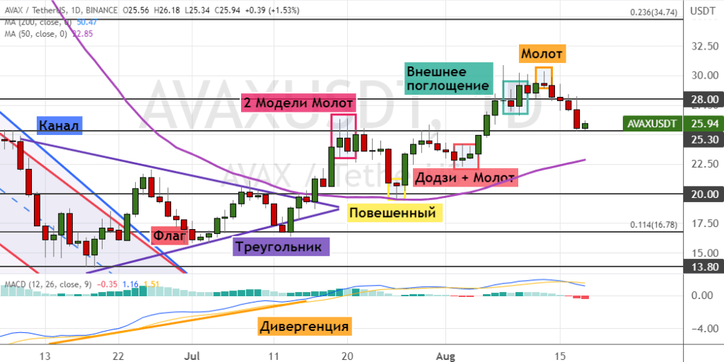 Закрытие дневных свечей выше текущих сопротивлений $28 и $30 станет сигналом о восстановлении восходящей динамики. В таком случае краткосрочный бычий тренд позволит котировкам AVAX подняться до первых целей $32, $34.80 и $40. В пользу развития этого сценария торгов указывает восемь сигналов теханализа: модели «Додзи» и «Молот» (отмечены светло-розовым цветом), «Внешнее поглощение» (отмечена бирюзовым цветом) и «Повешенный» (отмечена желтым цветом), преодоление верхних границ моделей «Флаг», «Канал» и «Треугольник», а также бычья дивергенция между ценой на графике и осцилляторе MACD.