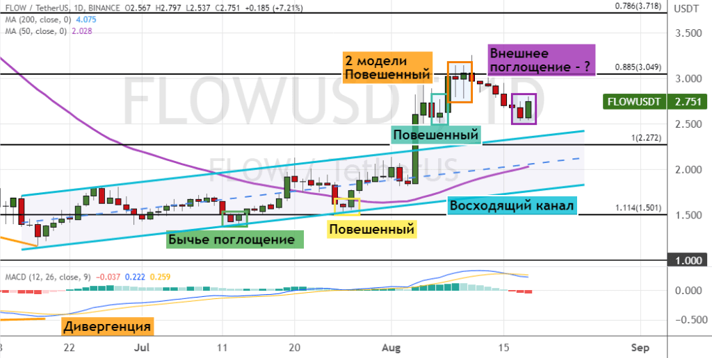 Закрытие дневных свечей выше границ консолидации $3–$3.5  в рамках краткосрочного бычьего тренда приведет к росту котировок FLOW до первых целей на уровнях $3.8, $4 и $4.3. Между $4 и $4.3 также проходит линия 200-дневной SMA. В пользу развития этого варианта торгов указывает вероятное формирование модели «Внешнее поглощение» (обозначены фиолетовым цветом) и пять следующих сигналов: три модели «Повешенный» (границы отмечены бирюзовым и желтым цветом), «Бычье поглощение», а также преодоление верхней границы «Восходящего канала» и бычья дивергенция между ценой на графике и осцилляторе MACD.