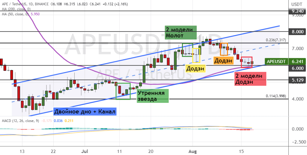 При этом сигналом о восстановлении бычьей динамики станет рост котировок APE выше уровня $7.3. Дальше быки будут готовы протестировать первые цели — $8, где также проходит верхняя граница модели теханализа «Восходящий канал» (обозначена синим цветом), и $9.2. В перспективе закрытие дневных свечей выше этих уровней приведет к развитию среднесрочного восходящего тренда. Это позволит котировкам токена направиться к уровням $10 и $11.3. В пользу реализации такого прогноза указывает возможное формирование трех моделей «Додзи» (обозначены розовыми и желтыми линиями) и двух сигналов теханализа в виде моделей «Двойное дно» и «Утренняя звезда».