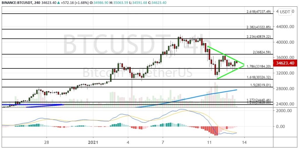 Сопротивлением для текущих котировок выступает уровень $36 824. Если биткоину удастся пробить его, а также закрепиться выше границ модели теханализа «Треугольник», это позволит активу в краткосрочной перспективе подняться до уровня сопротивления $40 840 и далее к $43 320. Эти цели рассчитаны на основе расширений пропорции уровней по Фибоначчи.