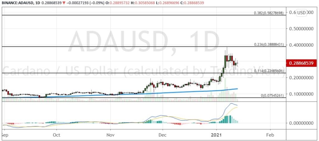 На этой неделе криптовалюта ADA проекта Cardano вытеснила из рейтинга Bitcoin Cash. После того как актив достиг важного уровня сопротивления на отметке $0.3890 (23.6% коррекция по уровням пропорции Фибоначчи), его котировки отступили к поддержке на уровне $0.2270. Однако это не помешало ADA ворваться в топ-5 криптовалют по капитализации.
