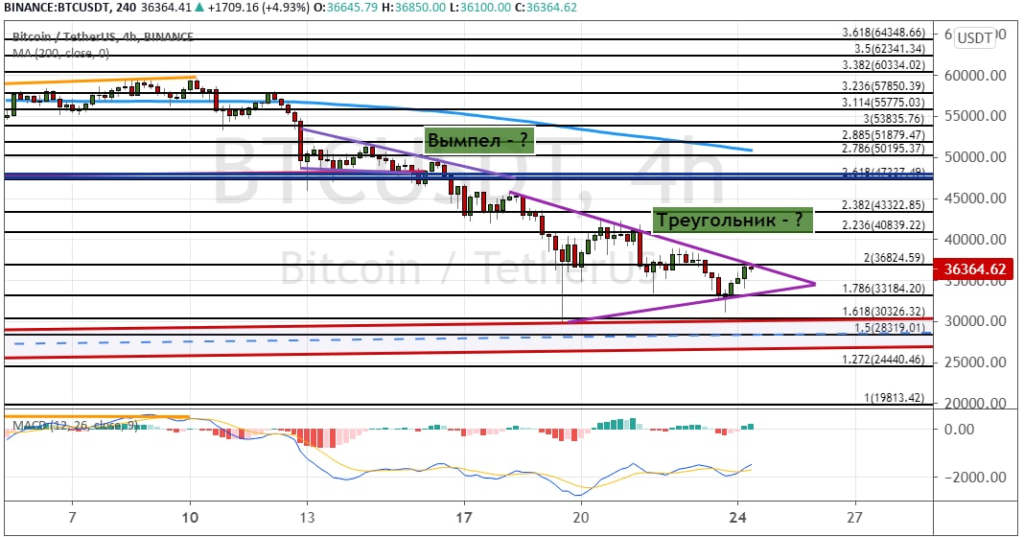 В выходные биткоин развивал консолидационное движение между поддержкой на $33 200 и сопротивлением $36 800, которое приобрело вид модели технического анализа «Треугольник».