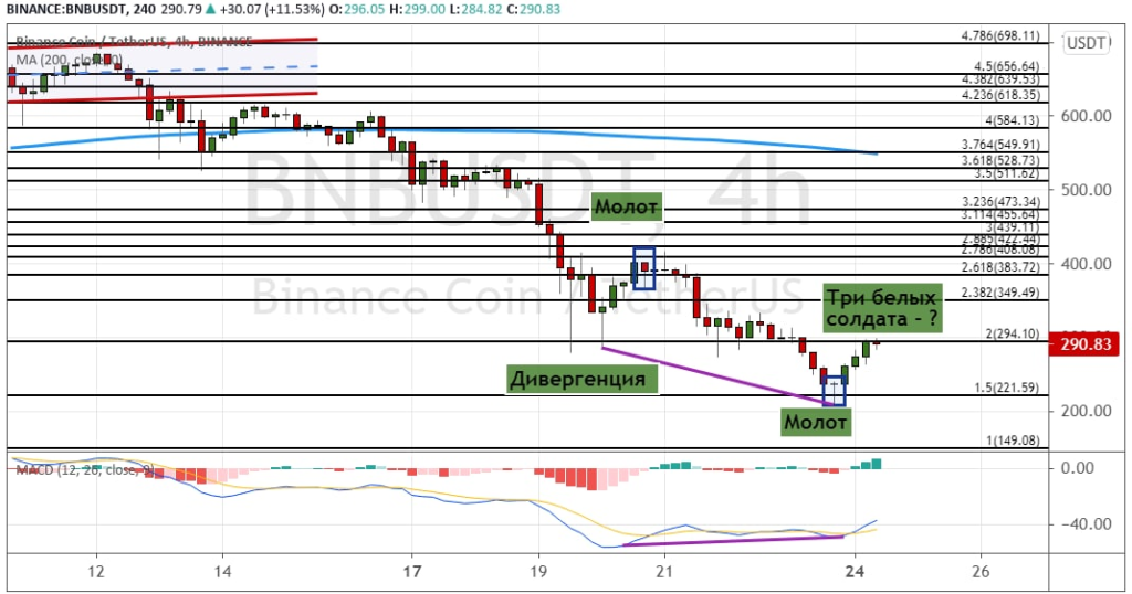 Но вероятное появление в последние часы свечной комбинации «Три белых солдата» может указывать на то, что цена готова вернуться к поддержке на $220, где проходит линия 200-дневной SMA. В случае реализации это позволит BNB снизиться к уровням $180 и $150.