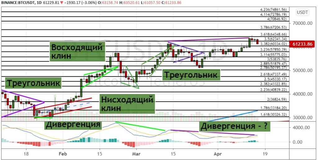 С точки зрения теханализа начинается развитие медвежьего сигнала в виде дивергенции между ценой на графике и осцилляторе MACD. Это позволит медведям опустить цену BTC до кластера уровней $60 000 – $60 330, а при более глубоком снижении и до $57 900 и $55 800.