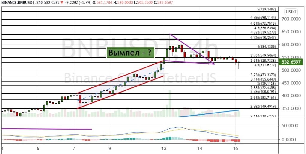 Котировки BNB после ложного выхода вверх за рамки модели теханализа «Вымпел» (обозначена на графике ниже) начали снижаться вместе со всем рынком цифровых активов. Не смогли устоять поддержки на уровнях $550, $530 — BNB пробил их обе. На уровне поддержки $510 произошел отскок и BNB временно пошел вверх, однако сейчас на графике снова наблюдается нисходящее движение. В случае ухода ниже $500 стоит ожидать движения к уровням $455 и $474.