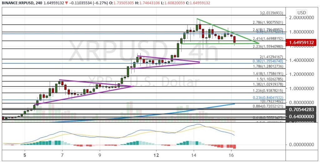 Котировки XRP после взлета к $1.90 и $2 начали развивать коррекционную динамику, что привело к формированию приведенной на графике ниже модели теханализа «Нисходящий треугольник». Уход ниже $1.56 позволит крипто-активу вновь протестировать районы уровней $1.41, $1.36 и $1.28.