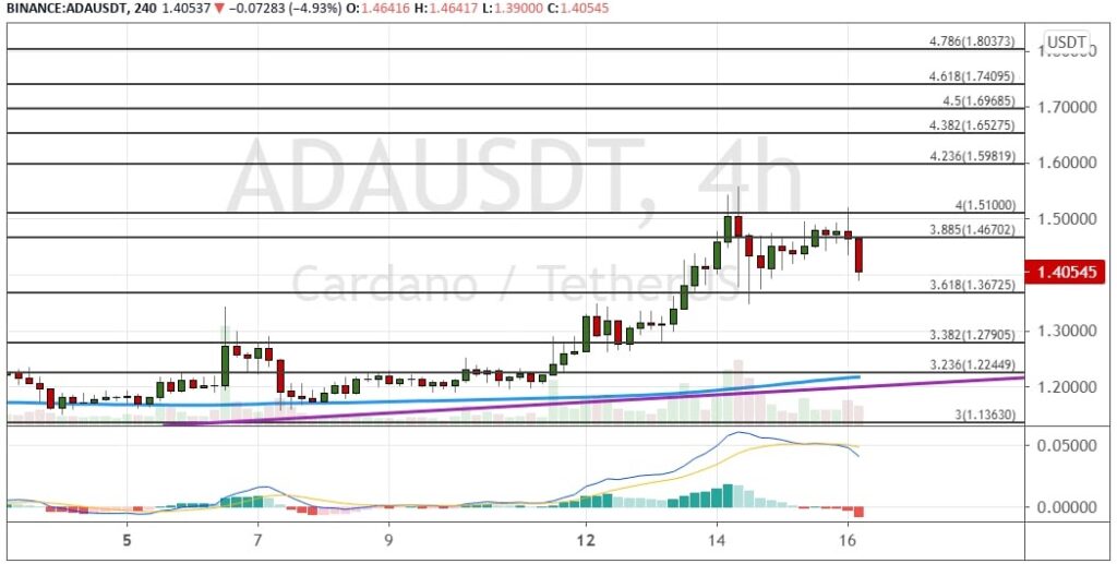 Котировки ADA после отскока от важных сопротивлений на уровнях $1.47 и $1.51 начали развивать коррекционное движение к поддержке на $1.3680. Более глубокое снижение приведет к формированию модели «Двойная вершина». Это позволит медведям направить цену альткоина к $1.28 и $1.2250, где проходит линия 200-дневной простой скользящей средней (SMA).