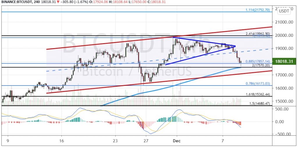 На крипторынке развивается коррекционная динамика, однако это движение было вполне ожидаемым. Ведь для сохранения среднесрочного восходящего тренда быкам необходимо набрать больше позиций. Одним из катализаторов коррекции стала новость о выпуске облигаций MicroStrategy на сумму $400 млн, на которые компания планирует приобрести биткоины. В результате этого решения аналитики Citigroup выпустили отчет, в котором порекомендовали своим клиентам продавать акции MicroStrategy, что привело к 14% падению стоимости ценных бумаг компании. Напомним, что ранее MicroStrategy стала одной из немногих компаний с Уолл-стрит, сообщившей о готовности перевести все резервы в биткоин. Тем не менее крипторынок продолжает привлекать финансовое сообщество, что в перспективе может стать поводом для продолжения растущего тренда. Так, 8 декабря эксперты банка Wells Fargo в свежем отчете отметили,  что биткоин станет самым инвестиционно привлекательным активом 2020 года. Им вторит телезвезда и ведущий программы «Shark Tank» Кевин О’Лири, который 7 декабря рассказал о готовности вкладывать 5% своего инвестпортфеля в биткоин. Однако главным препятствием для О’Лири остается отсутствие на рынке фондов ETF на биткоин. Но что говорит теханализ о краткосрочных перспективах топовых криптовалют?