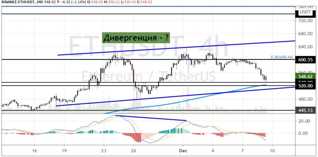 Котировки эфира, вслед за первой криптовалютой, двигаются вниз. Однако в перспективе рост спроса на актив приведет к сохранению растущей тенденции. Но пока от  сопротивления на уровне $600 (38.2% коррекция по уровням Фибоначчи) ETH обвалился к первой цели в виде поддержки $520 – $550, где проходит нижняя граница «Восходящего канала» и 200-дневная SMA. На продолжение снижения также указывает «дивергенция» между графиком и MACD. Новый импульс на продажу отправит котировки ETH к $475 – $500, а далее к $445.