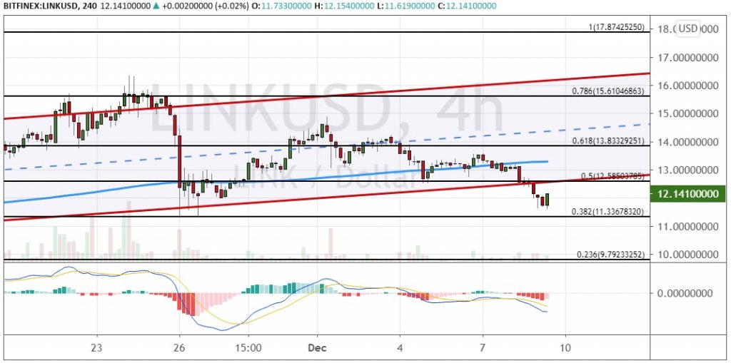 Вслед за остальными активами котировки LINK прорвали поддержку на уровне $12.58 (50% коррекции по линиям Фибо), где также находилась нижняя граница модели теханализа «Восходящий канал». В результате первой целью выступит линия сопротивления на уровне $11.33.