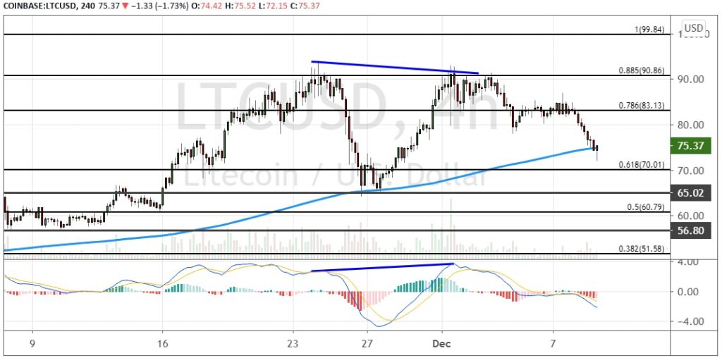 После прорыва поддержки $83 (78.6% коррекция по уровням Фибоначчи) лайткоин отправился на снижение к цели $75, где проходит линия 200-дневной SMA. Сигналом о грядущем снижении стало развитие «медвежьей дивергенции».