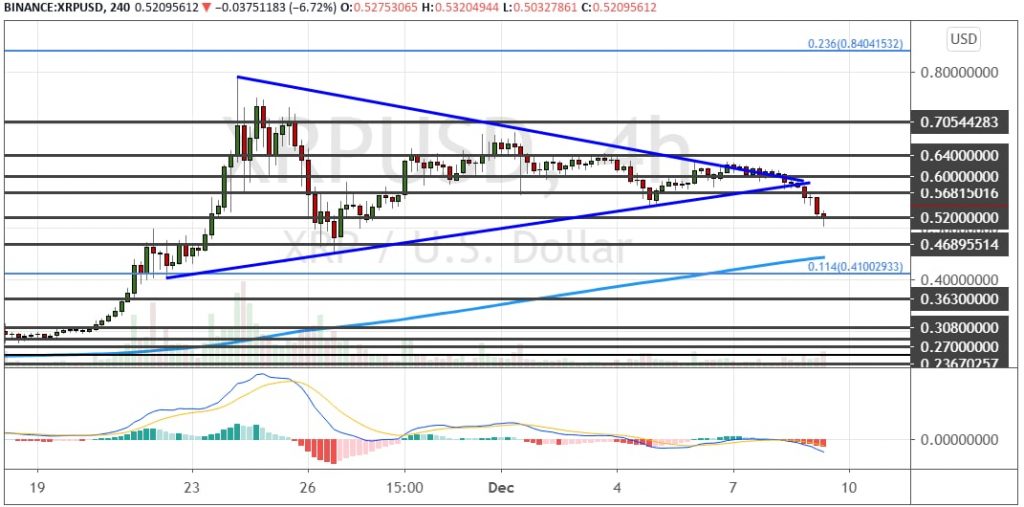 Однако от них может начаться развитие новой волны роста к важной линии сопротивления на уровне $0.60. Если риплу удастся преодолеть ее, то следующей целью станет сопротивление $0.64, после которого альткоин отправится к отметкам $0.7054, $0.80 и $0.84 (23.6% коррекция по линиям пропорции Фибоначчи).