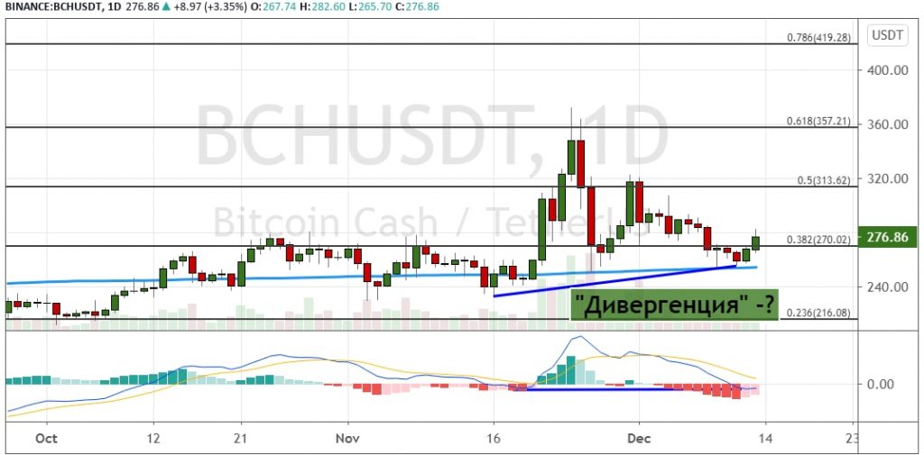 Котировки Bitcoin Cash могут начать реализацию бычьего сигнала в виде отскока от отметки $250, линии 200-дневной SMA, а также дивергенции между ценой на графике и MACD. Если активу удастся подняться выше $270, в перспективе это позволит цене BCH устремиться к целям $300 и $313.62 (50% коррекция по линиям Фибоначчи). Это может привести к тестированию сопротивления $357.21 и максимума ноября $375.