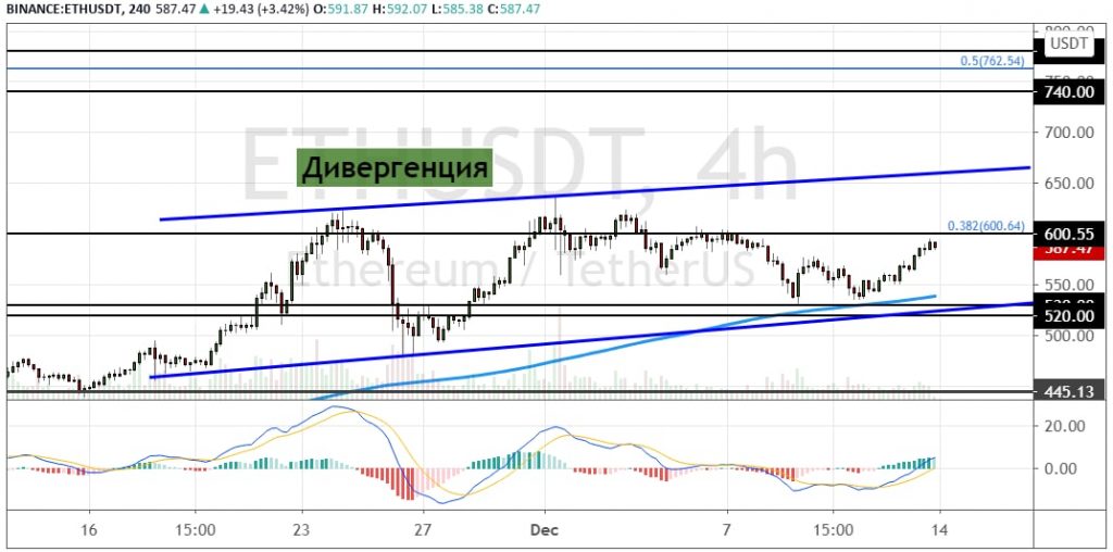Эфир после ретеста поддержки в виде области $520 – $550, где проходит нижняя граница «Восходящего канала» и 200-дневная SMA, устремился вверх. Это может привести к достижению недавно протестированного сопротивления $600 (38.2% коррекция по уровням Фибоначчи). В предстоящие дни возможно пробитие этого уровня и дальнейшее движение вверх к $630, $660 и $700. В перспективе среднесрочный тренд может привести к тестированию целей $740, $762.54 (50% коррекция по Фибоначчи) и $780, которые ранее выступали локальными экстремумами.