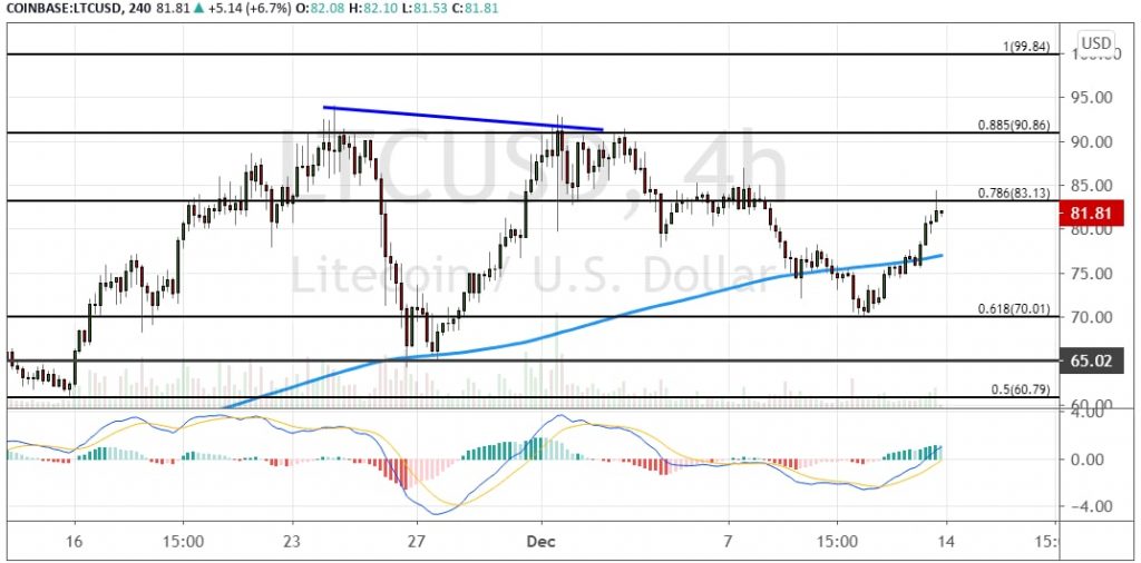 Лайткоин сформировал разворотную техническую комбинацию «Перевернутая голова и плечи», что позволило цене устремиться вверх от важных поддержек в виде уровней $70 и $75 и далее к первой цели $83 (78.6% коррекция по уровням Фибоначчи).