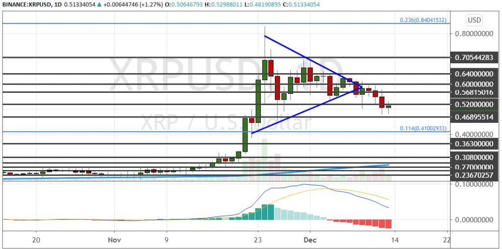 Рипл приостановил снижение после достижения поддержки на уровне $0.4690, где проходит 200-дневная SMA. Сохранение нисходящего импульса позволит альткоину опуститься к $0.41 (11.4% коррекция по линиям пропорции Фибоначчи).