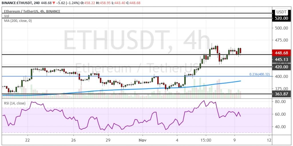 Сейчас ключевое сопротивление для ETH находится в районе кластера $420 – $445. В перспективе ближайших дней стоит ожидать сохранения растущей динамики, что позволит стоимости актива подняться до $480. В среднесрочной перспективе важным сопротивлением станет кластер $520 – $530.