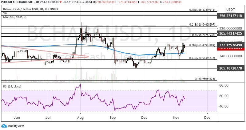 На графике биткоин кэша сформировалась опасная для быков дивергенция, которая может указывать на развитие продаж в краткосрочной перспективе. Поддержками для котировок BCH выступает линия 200-дневной скользящей средней (MA), которая расположена в районе $240 и $230. Следующей поддержкой выступает краткосрочная цель $205.