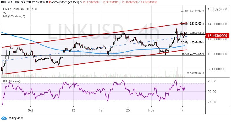С сентября котировки линк развивают восходящее движение в границах модели теханализа  «Параллельный канал». Текущим сопротивлением для актива выступает уровень $12.58 (50% коррекция по линиям Фибоначчи). В краткосрочной перспективе высока вероятность того, что линк достигнет цели $13.84 (61.8% коррекция по линиям Фибо). Что касается среднесрочной перспективы, то здесь целью для покупателей выступает кластер $15.61 – $16. Поддержкой выступают линия 200-дневной MA и уровень $11.30.
