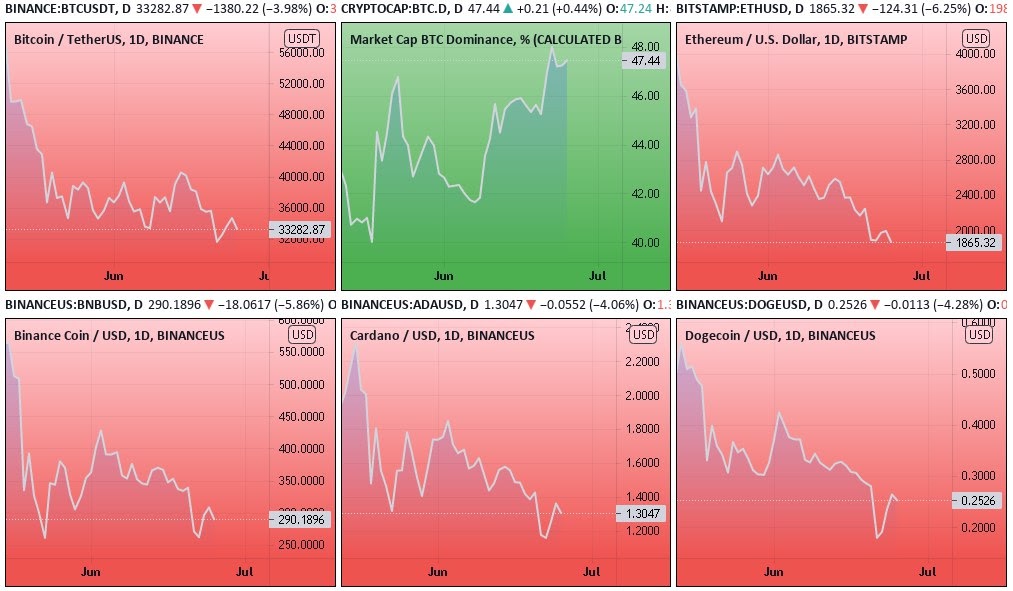 Графики котировок BTC, ETH, BNB, ADA, DOGE и доминации биткоина. Источник.