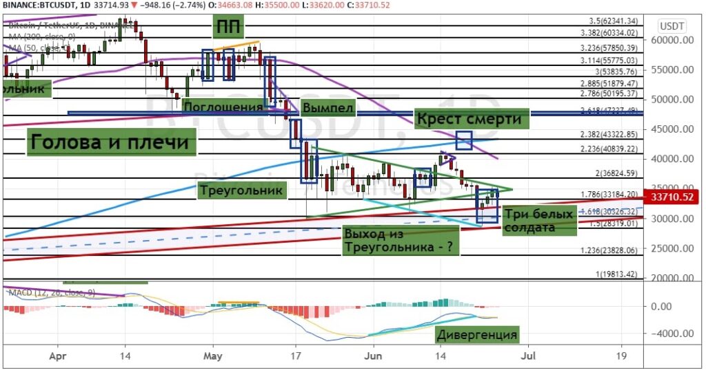 Биткоин достиг нижней границы модели теханализа «Треугольник» (отображена на графике ниже), но не смог пробить ее. Это привело к повторному снижению до поддержки $33 200.