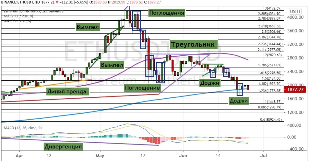 Эфир так и не смог преодолеть важное сопротивление в районе $1 972. Однако при этом котировки ETH все еще не опустились ниже линии 200-дневной SMA. Тем не менее, если несколько дневных свечей закроются ниже границ кластера $1 780 – $1 820, это приведет к снижению эфира до уровней $1 500, $1 300 и $920.
