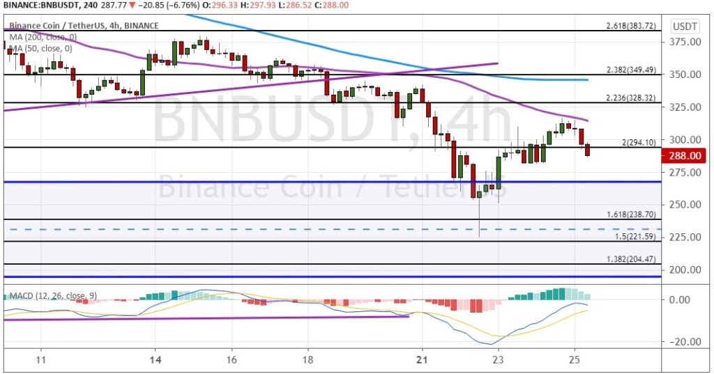 Котировки BNB не смогли преодолеть линию 50-периодной SMA (показана на графике ниже), что позволило альткоину пробить поддержку $294. Текущими целями для снижения выступают $280 и $250. Их пробитие направит котировки BNB к $220 и $200. Более глубокая коррекция к поддержкам $150, $120 и $100 пока не представляется возможной.