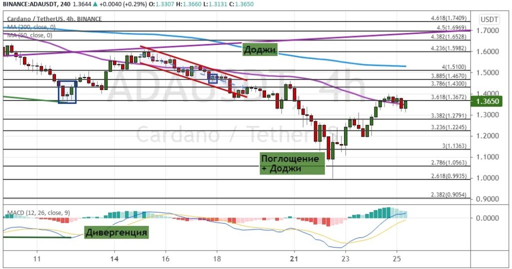 ADA продолжает торговаться в районе $1.3680, где проходит линия 50-периодной SMA (показана на графике ниже). Это может открыть возможности для развития нисходящего движения к уровням $1.28, $1.20, $1.10 и $1. В пользу этого указывает выход цены из зоны перепроданности на MACD.