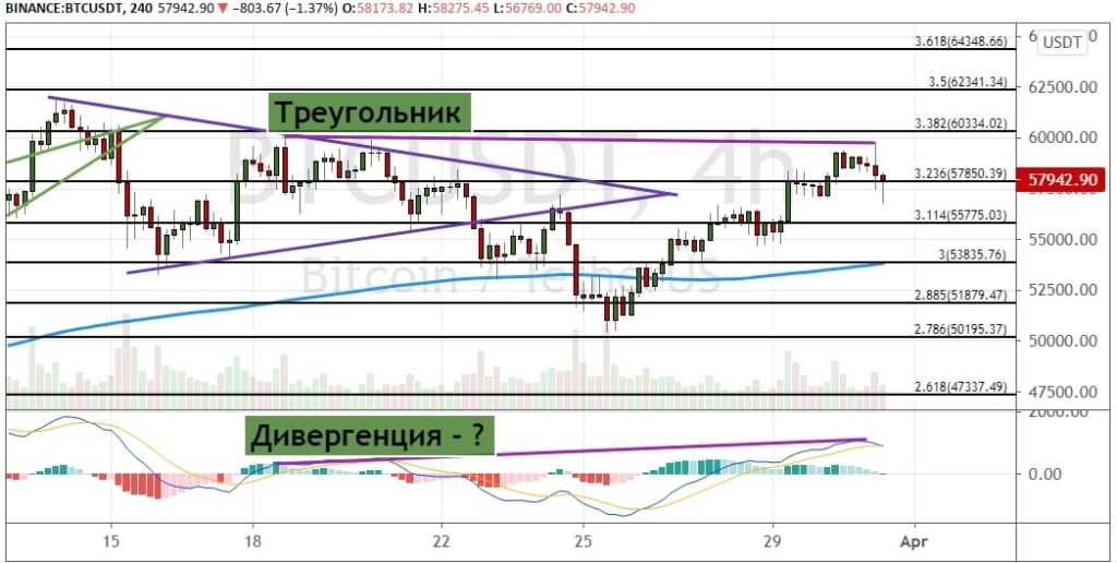 На фоне новости от PayPal биткоин продемонстрировал взрывной рост, что привело к достижению целей на уровне $57 900 и ключевой области $60 000 – $60 330. Текущие торги проходят между этими уровнями.