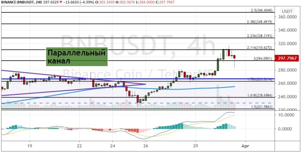 Но стоит отметить, что текущие котировки также находятся в зоне «перекупленности» на осцилляторе MACD. Это позволит стоимости BNB снизиться обратно к поддержке на $263, где также проходят верхняя граница «Параллельного канала» и линия 200-дневной SMA. Дальнейшее движение вниз будет поддержано уровнями $238, $220 и $200. Маловероятным пока выглядит вариант с дальнейшим снижением к уровням $180, $165 и $150.