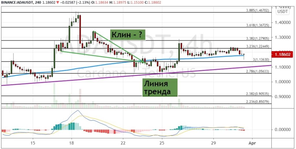 ADA продолжает консолидироваться между уровнями $1.3630 и $1.2250, ниже которых проходит восходящая линия тренда, представленная на графике ниже.
