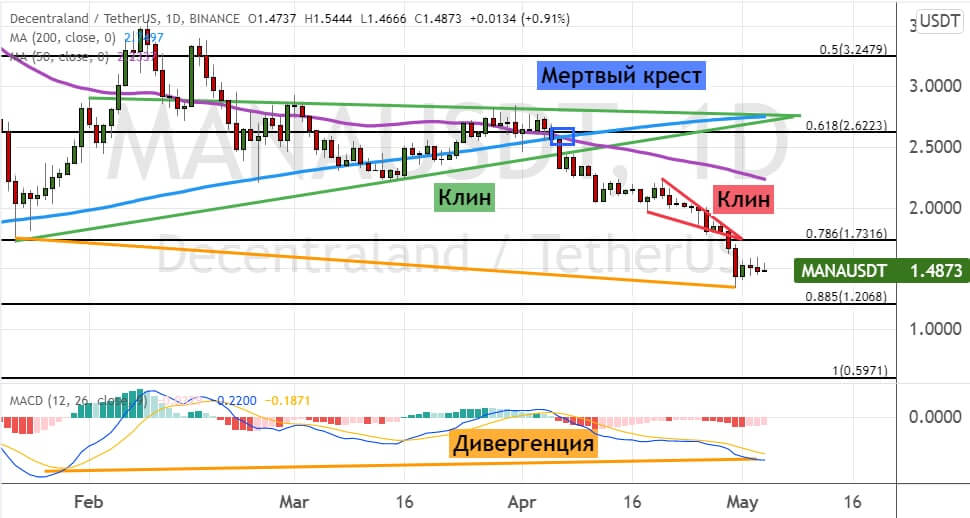 Рост выше уровней $1.73 и $2 приведет к восстановлению краткосрочной бычьей динамики. Целями для MANA выступят уровень $2.25, где также проходит линия 50-дневной SMA, и границы кластера $2.5–$2.63, где также проходят границы модели «Клин» (отмечены линиями зеленого цвета), и линия 200-дневной SMA. В пользу этой идеи указывает сигнал в виде бычьей дивергенции между ценой на графике и осцилляторе MACD.