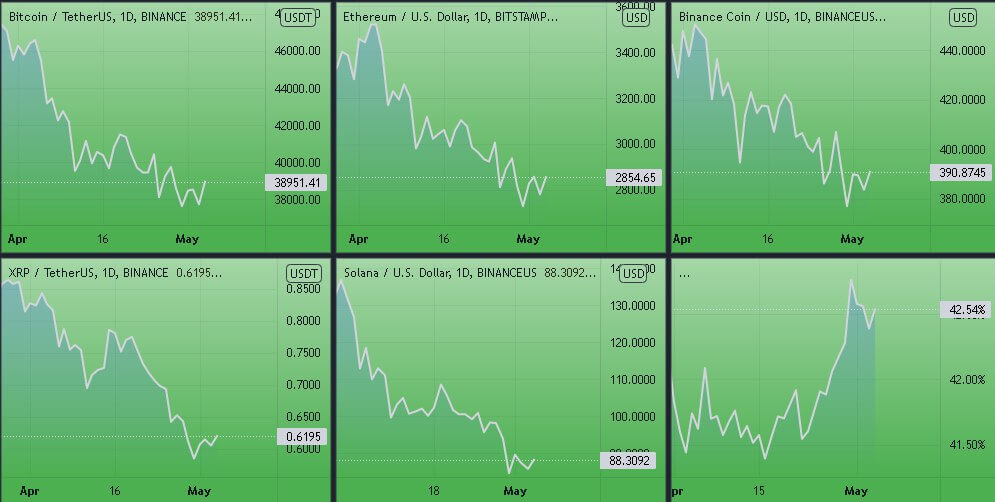 Динамика котировок BTC, ETH, BNB, SOL, XRP (дневной таймфрейм) и график доминации биткоина. Источник