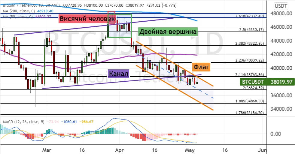 Котировки BTC поднялись выше уровня поддержки $38 800, где проходят границы моделей теханализа «Канал» (обозначена на графике ниже линиями фиолетового цвета) и «Флаг» (обозначена на графике ниже линиями оранжевого цвета).