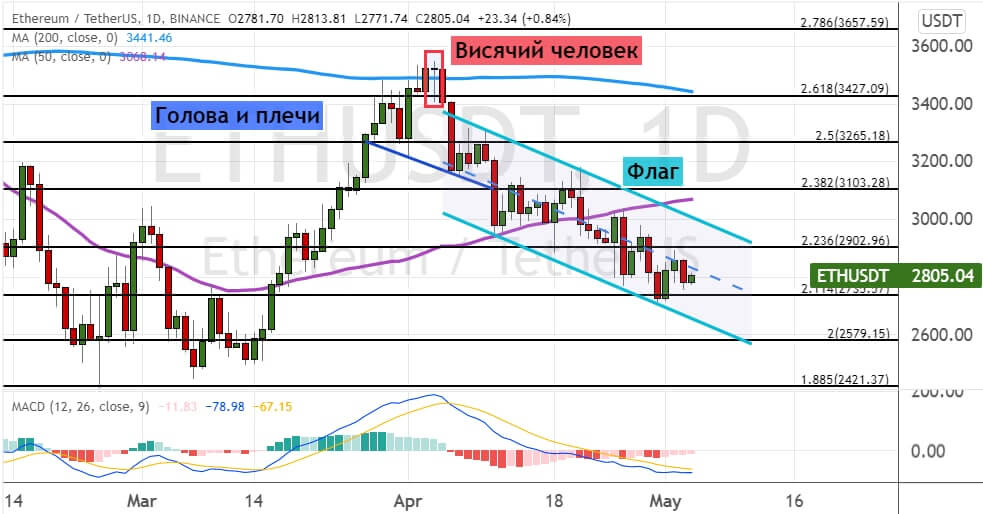 Котировки эфира торгуются в рамках границ модели теханализа «Флаг» (на графике ниже ее границы отмечены линиями бирюзового цвета), а также между уровнями поддержки $2 730 и сопротивления $2 900.