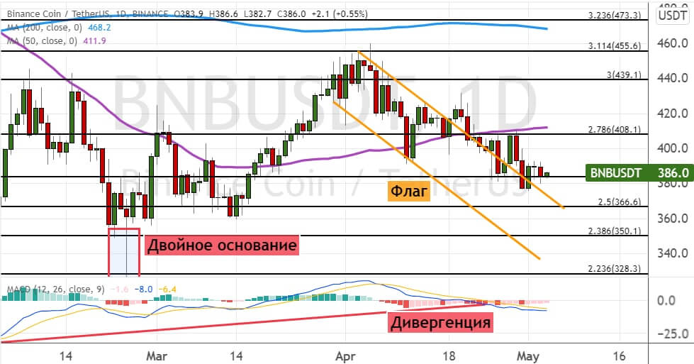В случае восстановления восходящей динамики стоит ожидать роста BNB до уровня $420. Дальше BNB направится к границам консолидации $440–$455 и уровню $474, где проходит линия 200-дневной SMA. В пользу развития этого прогноза указывают три сигнала: пробитие верхней границы модели теханализа «Канал» (обозначена на графике ниже оранжевым цветом), модель теханализа «Двойное дно» (обозначена на графике ниже красным цветом) и дивергенция между ценой на графике и MACD.