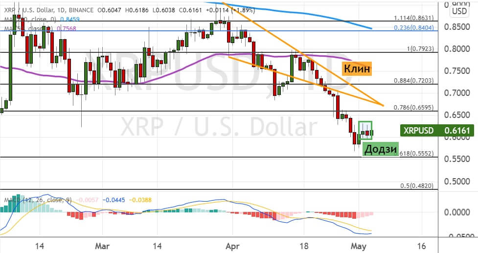 Формирование свечной модели теханализа «Додзи» (на графике ниже обозначена зеленым цветом) указывает на возможность перехода инициативы к быкам. Подтверждением для этого станет сигнал в виде роста дневных свечей выше уровней $0.66 и $0.72, где проходят границы модели теханализа «Клин» (на графике ниже обозначена оранжевым цветом), и линия 50-дневной SMA. В среднесрочной перспективе это может привести к движению котировок XRP к границам консолидации $0.84–$0.86, где также проходит линия 200-дневной SMA.