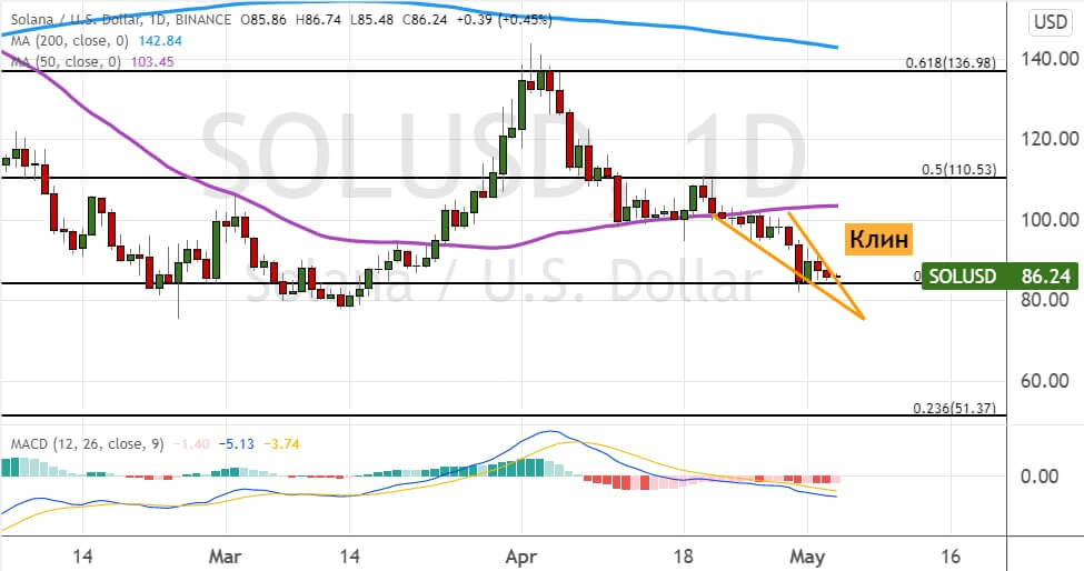 Котировки SOL вновь торгуются выше поддержки $84. В районе этого уровня проходят границы модели теханализа «Клин» (обозначена на графике ниже линиями оранжевого цвета). Если альткоин пробьет этот уровень поддержки, то нисходящее движение приведет к обвалу стоимости SOL до уровней $70 и $52.