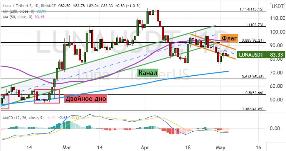 Лидером на рынке DeFi остается криптовалюта LUNA. Котировки альткоина консолидируются в районе уровня $82, где также проходит нижняя граница модели «Флаг» (обозначена на графике ниже линиями оранжевого цвета).