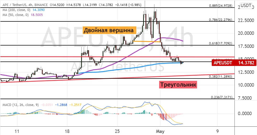 Текущие торги токеном проходят в районе $15, где также расположена верхняя граница «Треугольника» (отмечена линиями красного цвета) и линия 200-периодной SMA. Более глубокая коррекция приведет к снижению стоимости APE до поддержек $12.50 и $11.30. В пользу этой идеи также указывает сигнал в виде модели «Двойная вершина» (отмечена линиями бирюзового цвета).